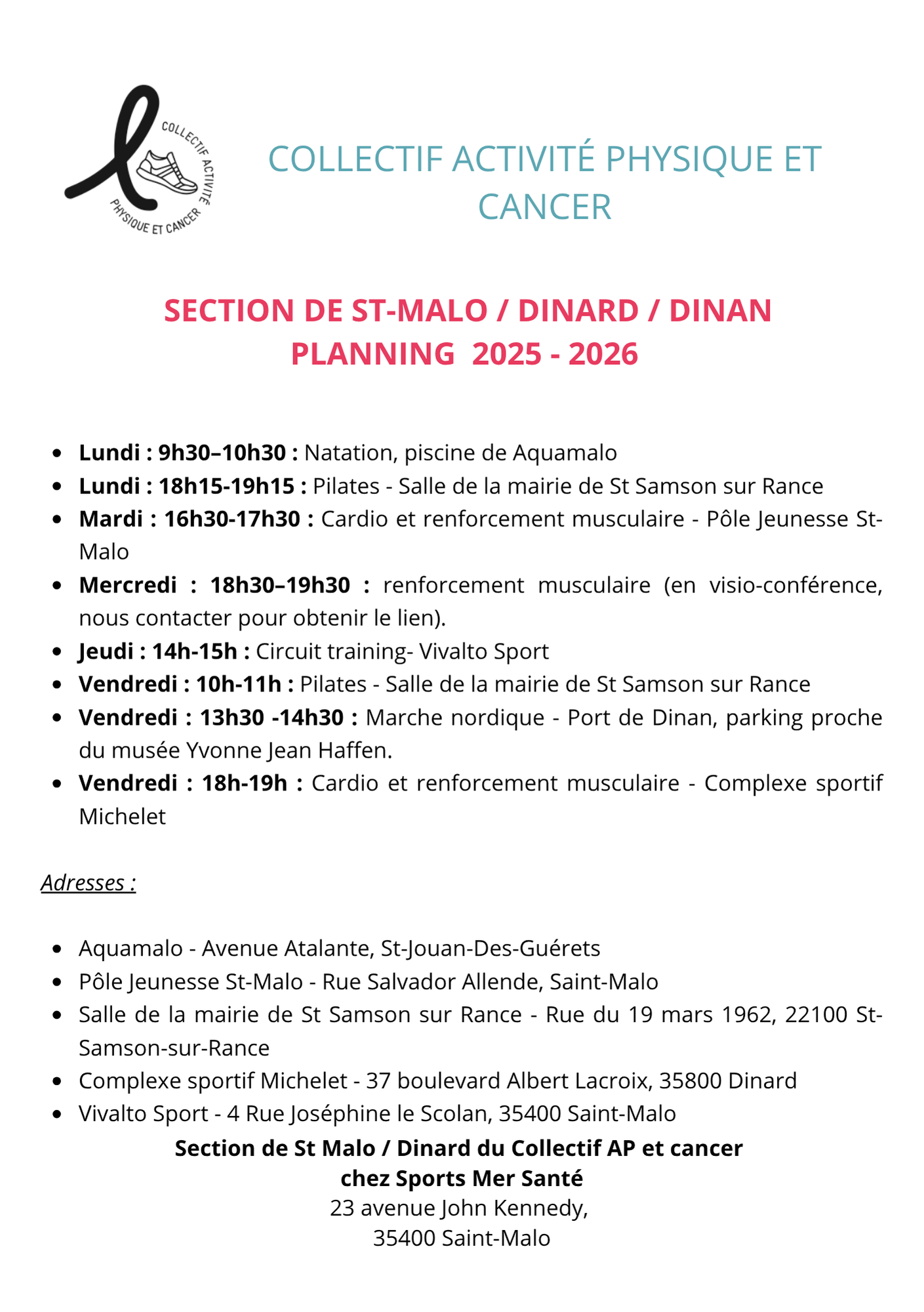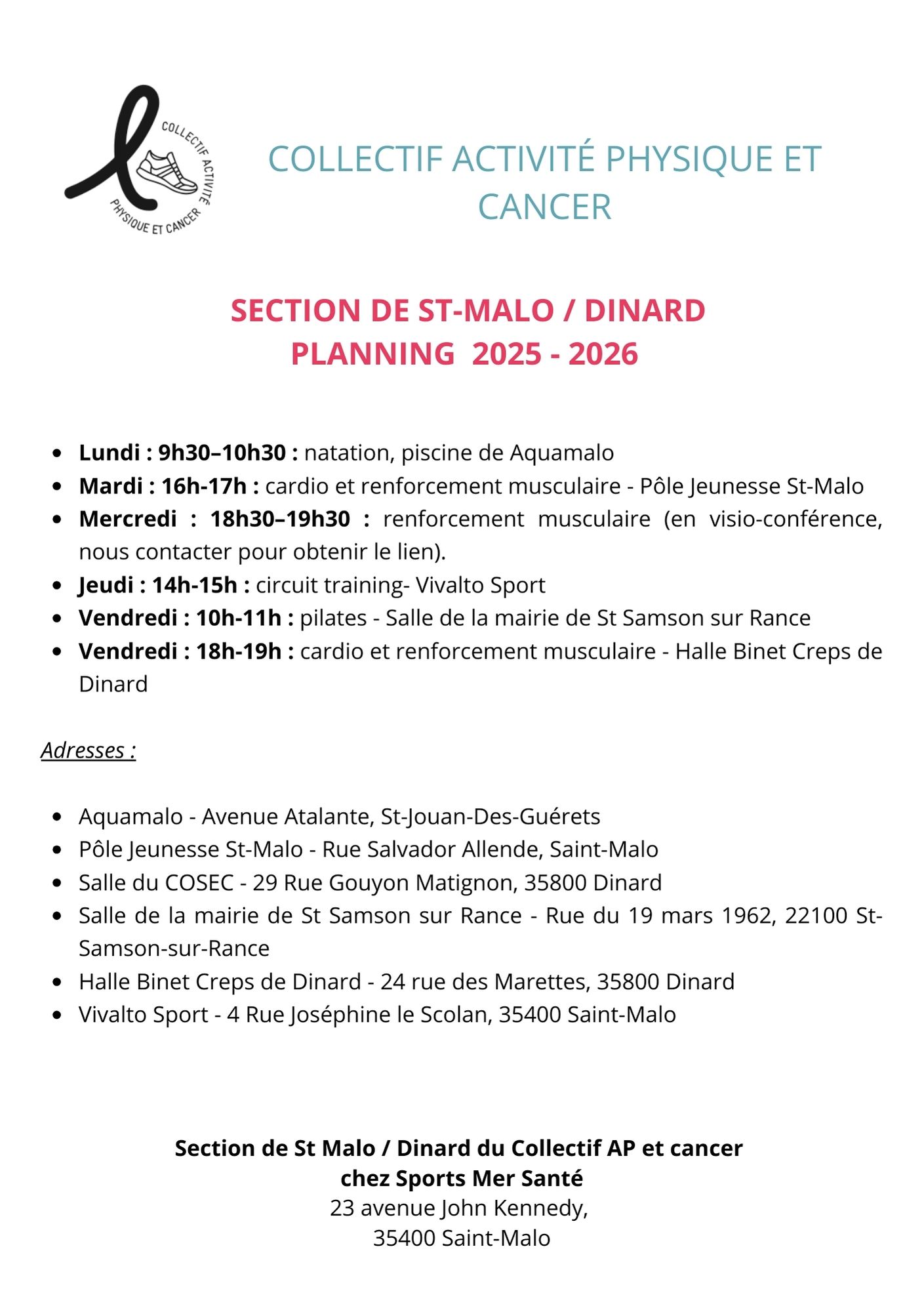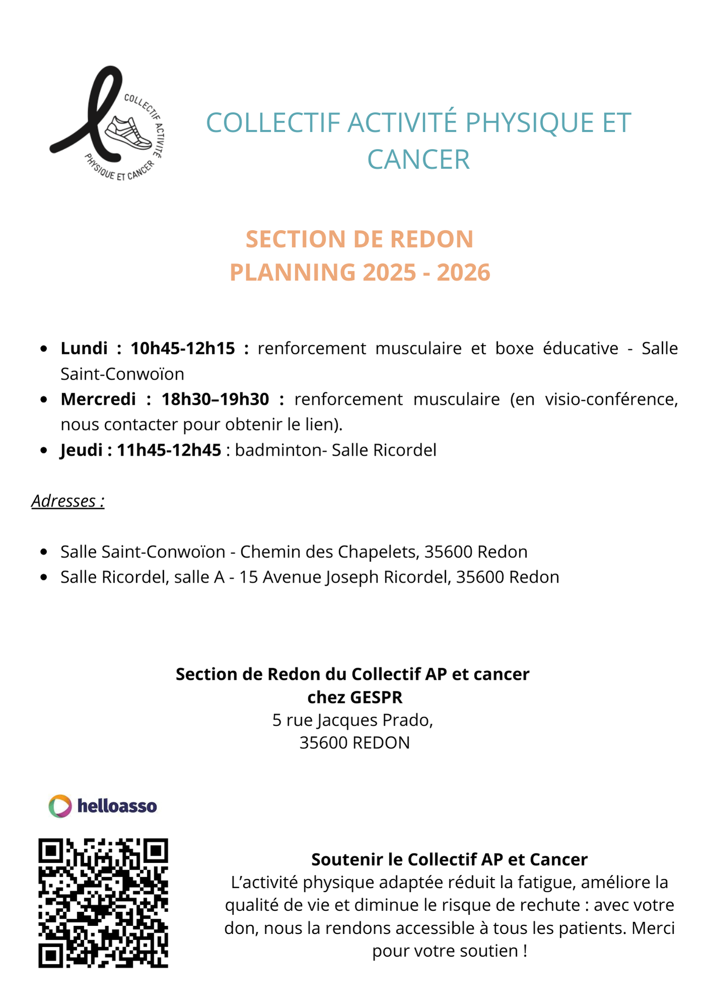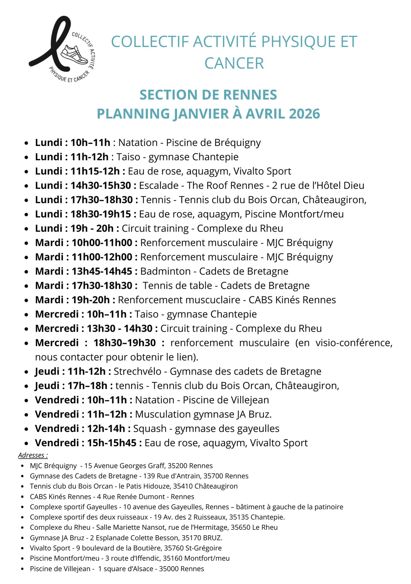 Guidées par la volonté d’élargir l’offre d’activité physique proposée aux patients atteints de cancer et parce que l’on est plus fort collectivement que seul, plusieurs associations du bassin rennais se sont réunies au sein du Collectif Activité Physique et Cancer. Sans empiéter sur ce que chaque association partenaire développe, les moyens réunis permettent, aux membres de ces associations, de pratiquer différents types d’activités scientifiquement reconnus comme bénéfiques dans cette pathologie.