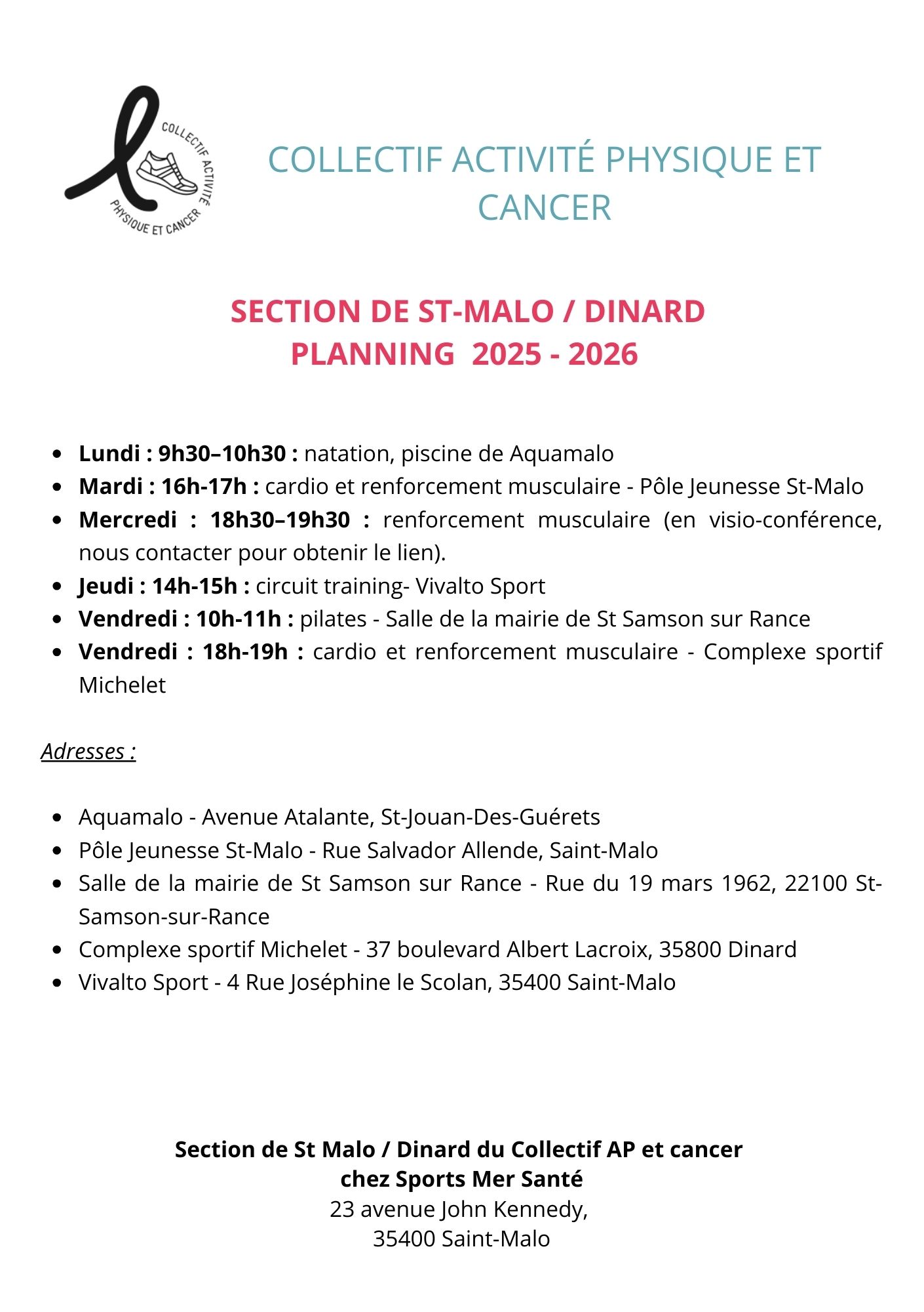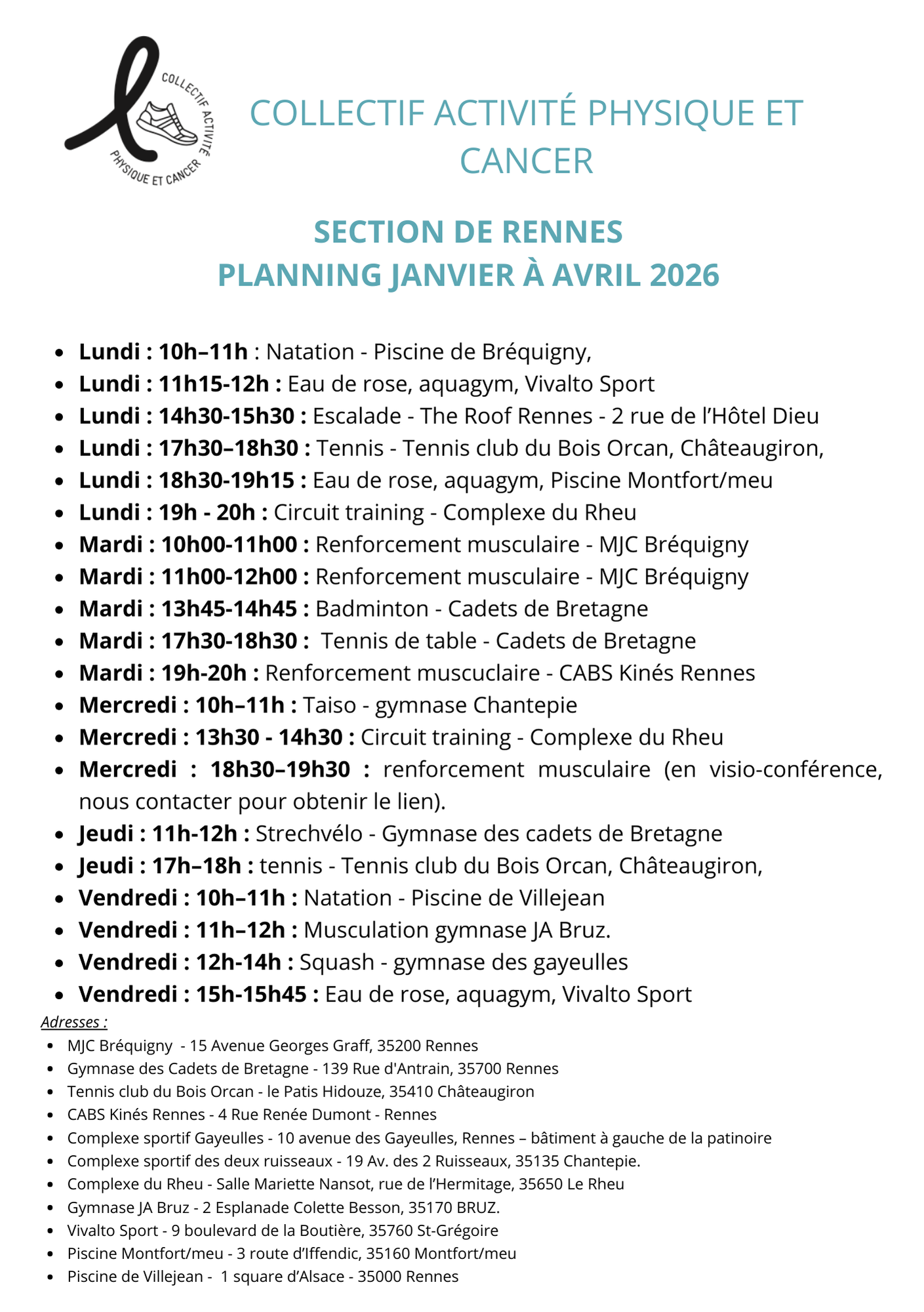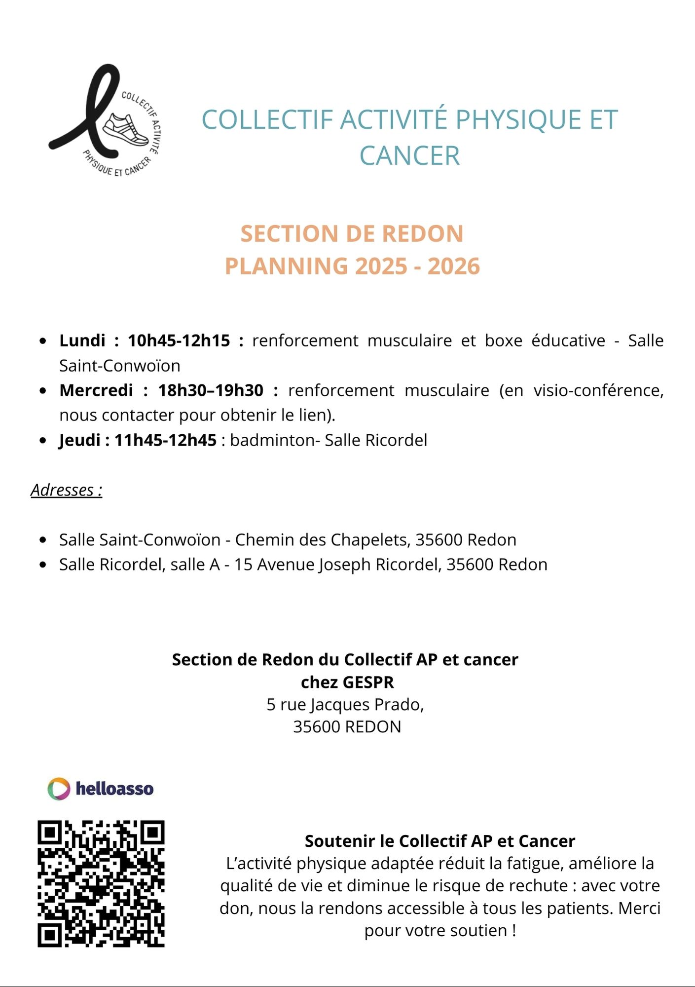 Guidées par la volonté d’élargir l’offre d’activité physique proposée aux patients atteints de cancer et parce que l’on est plus fort collectivement que seul, plusieurs associations du bassin rennais se sont réunies au sein du Collectif Activité Physique et Cancer. Sans empiéter sur ce que chaque association partenaire développe, les moyens réunis permettent, aux membres de ces associations, de pratiquer différents types d’activités scientifiquement reconnus comme bénéfiques dans cette pathologie.